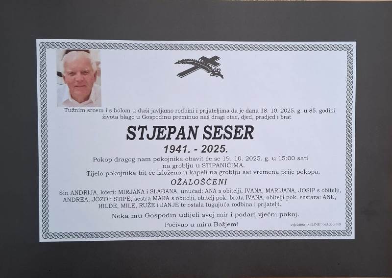 S tugom u srcu i bolom u duši javljamo svoj rodbini i prijateljima tužnu vijest da je naš dragi Stjepan Sesar blago u Gospodinu preminuo 18. listopada, 2025. godine, u 85. godini života.