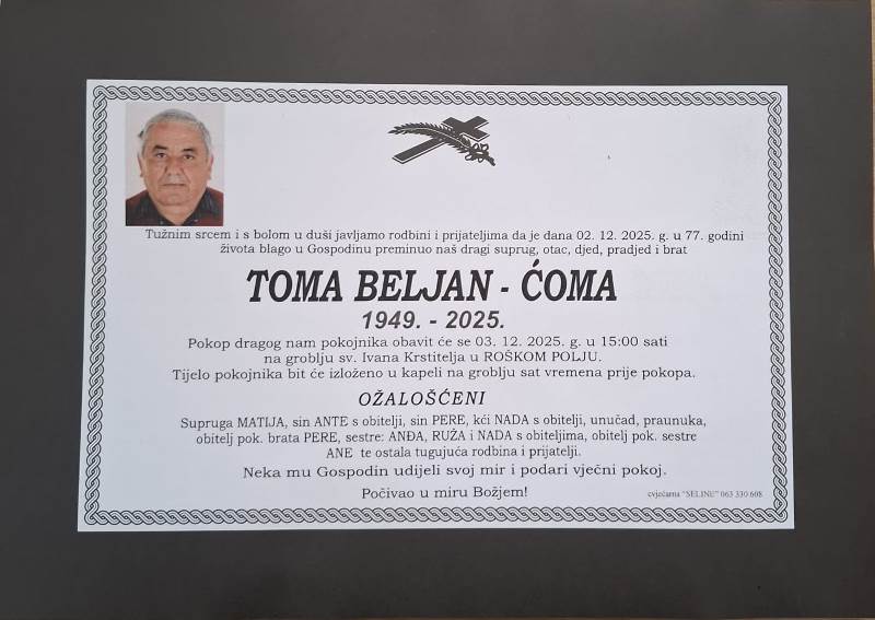 Tužnim srcem i bolom u duši javljamo svoj rodbini i prijateljima tužnu vijest da je naš dragi Toma Beljan-Ćoma blago u Gospodinu preminuo 2. prosinca, 2025. godine, u 77. godini života.