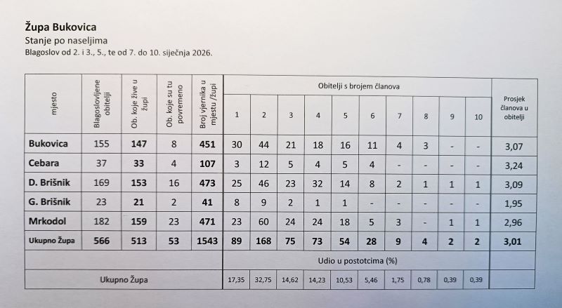 ŽUPA U BROJKAMA: Ovo su podatci po naseljima s početka 2026. godine u našoj župi.