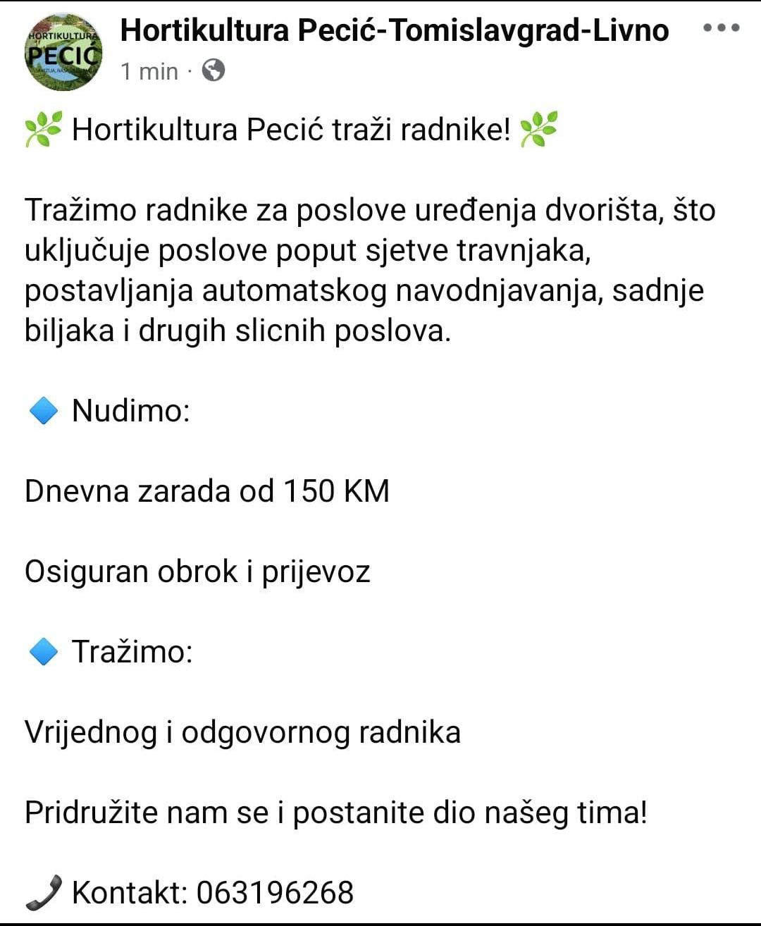 HB ZupanijaoglasOGLAS : HORTIKULTURA “Pecić” traži radnike!tomislavnews8. travnja 2026.posted on tra. 08, 2026 at 11:52 am1.21KPregleda Hortikultura “Pecić” Tomislavgrad-Livno traži radnike! www.tomislavnews.com/Oglas Tagovi:oglaspecićradniketražiShare on FacebookShare on XMoretomislavnews8. travnja 2026.prethodni članakKOMPANIJE Prvi hercegovački milijarder širi imperiju: Zaposlio još 80 radnikaidući članakNAJAVA: Hrvatski šahovski klub “Tomislav” organizira tradicionalni Uskrsni turnir Preporučujemo za vasHB ZupanijaTG GospodarstvoUSVOJENA Odluka o raspodjeli sredstava u okviru projekta „Poticaj gospodarskom razvoju Hercegbosanske županije“ tomislavnews29. travnja 2026.727 views727Pročitaj više...HB ZupanijaTG PolitikaIZVJEŠĆE s 56. sjednice Vlade HBŽ: Raspoređeno oko 500.000 KM za osnaživanje konkurentnosti gospodarstvatomislavnews28. travnja 2026.595 views595Pročitaj više...HB ZupanijaTG PolitikaIZVJEŠĆE s XXIII. sjednice Skupštine Hercegbosanske županije održane u Tomislavgradutomislavnews27. travnja 2026.1.24K views1.24KPročitaj više...