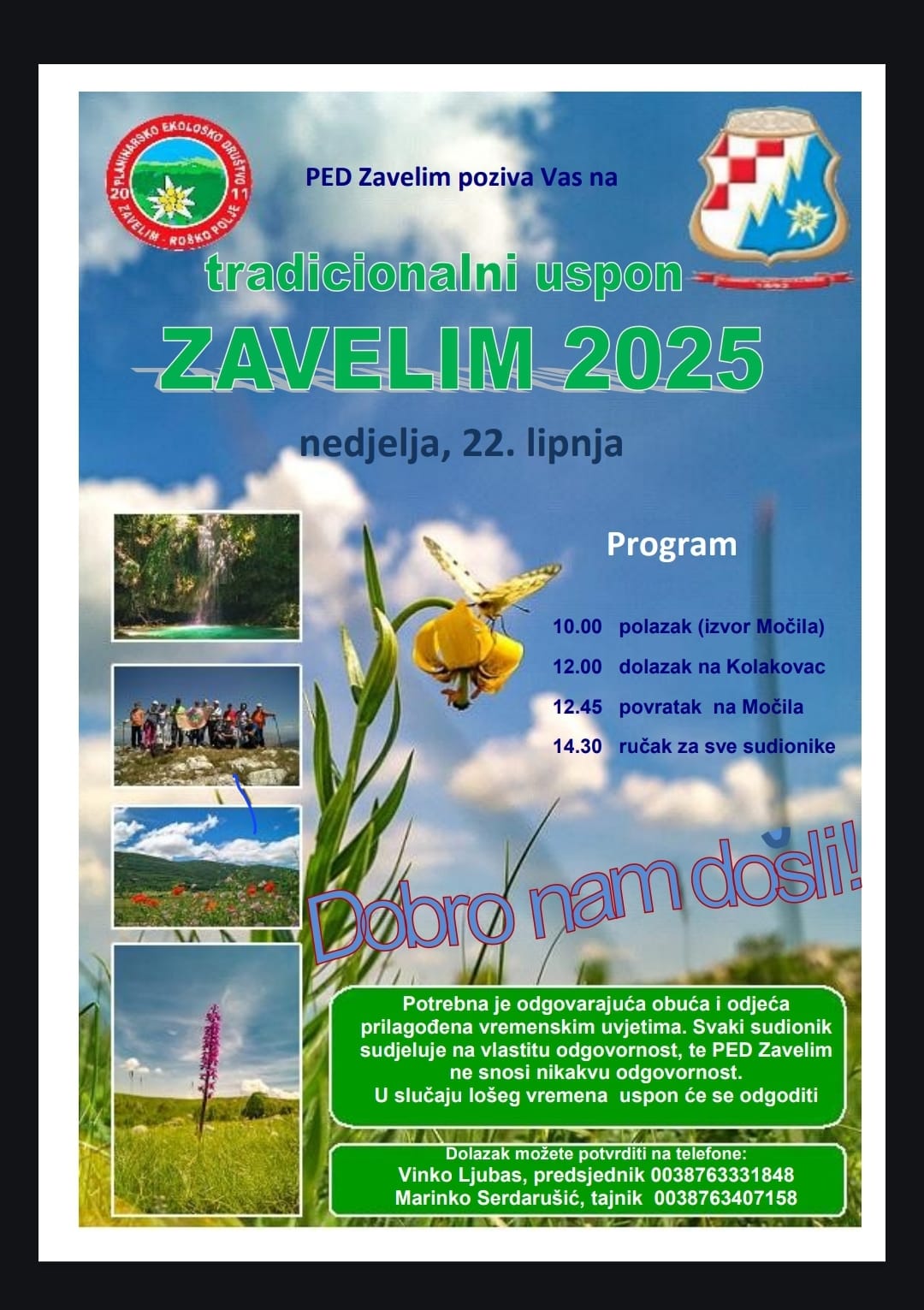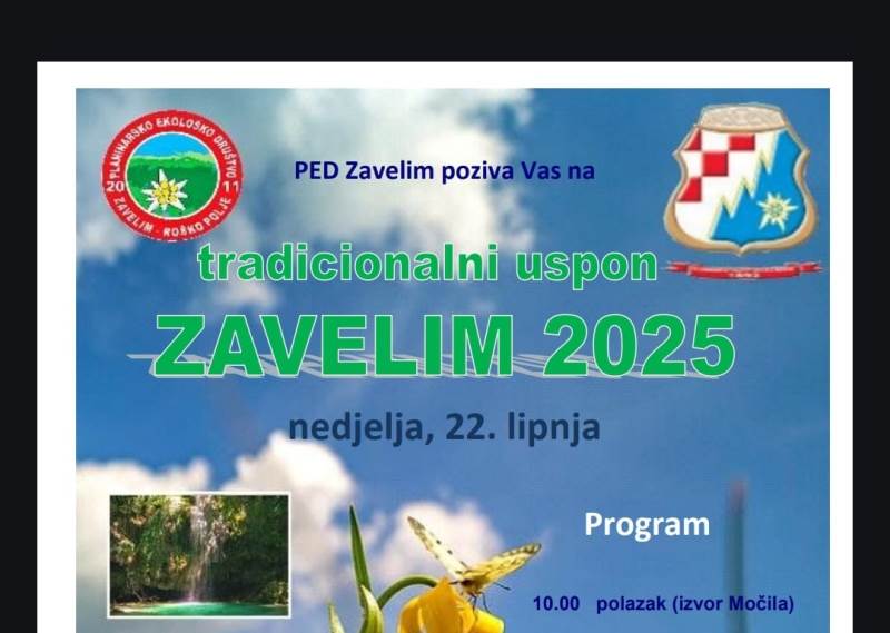 Planinarsko-ekološko društvo “Zavelim” organizira tradicionalni uspon na mitsku planinu Zavelim, u nedjelju, 22. lipnja, 2025. godine, a u čast svetog Ivana, zaštitnika Roške župe.