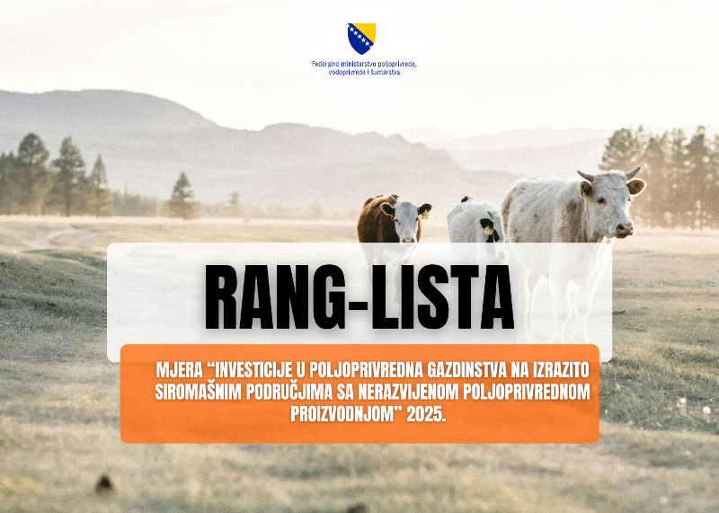 Federalno ministarstvo poljoprivrede, vodoprivrede i šumarstva obavještava javnost i korisnike da su objavljene rang-liste klijenata koji su ostvarili pravo na novčanu podršku u okviru mjera „Pokretanje poslovanja mladih poljoprivrednika (PMP)” te klijenata po mjeri „Investicije u poljoprivredna gazdinstva na izrazito siromašnim područjima s nerazvijenom poljoprivrednom proizvodnjom (ISP)”.