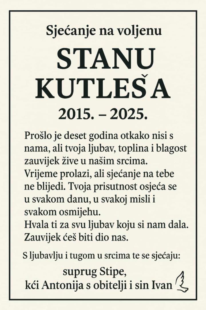 sjećanjeSJEĆANJE NA VOLJENU: Stana Kutleša (2015.- 2025.)tomislavnews20. listopada 2025.posted on lis. 20, 2025 at 9:11 am20. listopada 2025.1.35KPregleda Prošlo je deset godina otkako nisi s nama, ali tvoja ljubav, toplina i blagost zauvijek žive u našim srcima. www.tomislavnews.com Tagovi:kutlesasjećanjestanatgShare on FacebookShare on XMoretomislavnews20. listopada 2025.prethodni članakREZULTATI utakmica HNK “Tomislav” odigranih preko vikenda!idući članakFOTO/VIDEO/ČESTITKA: Uspješan nastup HKUD-a” Fra Jozo Križić” na Državnoj smotri izvornog folklora u Mostaru Preporučujemo za vasobljetnicesjećanjeFOTO/VIDEO: Obilježena 34. godišnjica stradanja hrvatskog naroda na Kupreškoj visoravnitomislavnews10. travnja 2026.565 views565Pročitaj više...sjećanjeIN MEMORIAM/U SJEĆANJE: Boško Papić (10. travnja 1992. – 10. travnja 2026.)tomislavnews10. travnja 2026.821 views821Pročitaj više...sjećanjeĆIKEŠA ČOLINA: Sa Kupresa kad zapušetomislavnews9. travnja 2026.1.18K views1.18KPročitaj više...
