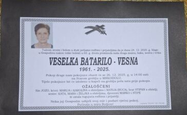OBAVIJEST O SMRTI: Preminula je Veselka Batarilo-Vesna (1961. – 2025.)