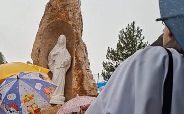 Danas smo se, unatoč kišovitom vremenu, odvažili i s malenim kišobranima izašli u dvorište kako bismo zajedno blagoslovili Gospin kip...