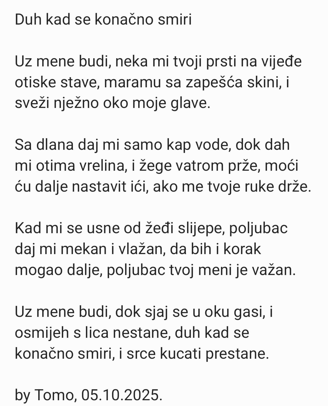 književnostTOMO RAIČ: Duh kad se konačno smiritomislavnews11. listopada 2025.posted on lis. 11, 2025 at 6:25 pm719Pregleda DUH KAD SE KONAČNO SMIRI www.tomislavnews.com/Foto ilustracija Tagovi:pjemaposušjeraičtomoShare on FacebookShare on XMoretomislavnews11. listopada 2025.prethodni članakFOTO/Završen Četvrti simpozij Doma zdravlja Tomislavgrad i Hrvatskog sestrinskog društva hitne medicine u Tomislavgradu: Više od 400 sudionika u dva danaidući članakFOTO/VIDEO: Danas je bila berba u vinogradu Marka Bakovića Kosalja u Mokronogama Preporučujemo za vasBosna i HercegovinaknjiževnostTG ČestitkeFOTO ČESTITKA: U sklopu 63. Šimićevih susreta održano predstavljanje zbirke „Pred našom kućom jabuka“ autora Mije Tokićatomislavnews24. travnja 2026.483 views483Pročitaj više...književnostFOTO: Obilježavanje Dana hrvatske knjige u Osnovnoj školi fra Mije Čuića Bukovicatomislavnews22. travnja 2026.712 views712Pročitaj više...književnostvjeraNIKOLA JURIŠIĆ: Put u Emaustomislavnews19. travnja 2026.528 views528Pročitaj više...