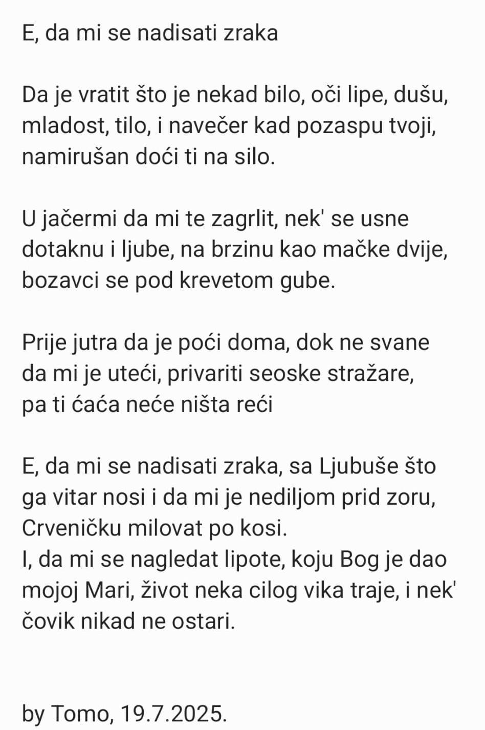 književnostTOMO RAIČ : E, da mi se nadisati zrakatomislavnews21. srpnja 2025.posted on srp. 21, 2025 at 7:44 pm1.2KPregleda E, DA MI SE NADISATI ZRAKA www.tomislavnews.com Tagovi:crvenicepjesmaposušjesjetatomoShare on FacebookShare on XMoretomislavnews21. srpnja 2025.prethodni članakNAJAVA: Veliki humanitarni kviz općeg znanja u Tomislavgraduidući članakFOTO: ODRŽANO XIV. pjesničko sijelo don Jurja Gospodnetića na Vidikovcu u Koritima Preporučujemo za vasBosna i HercegovinaknjiževnostTG ČestitkeFOTO ČESTITKA: U sklopu 63. Šimićevih susreta održano predstavljanje zbirke „Pred našom kućom jabuka“ autora Mije Tokićatomislavnews24. travnja 2026.491 views491Pročitaj više...književnostFOTO: Obilježavanje Dana hrvatske knjige u Osnovnoj školi fra Mije Čuića Bukovicatomislavnews22. travnja 2026.713 views713Pročitaj više...književnostvjeraNIKOLA JURIŠIĆ: Put u Emaustomislavnews19. travnja 2026.531 views531Pročitaj više...