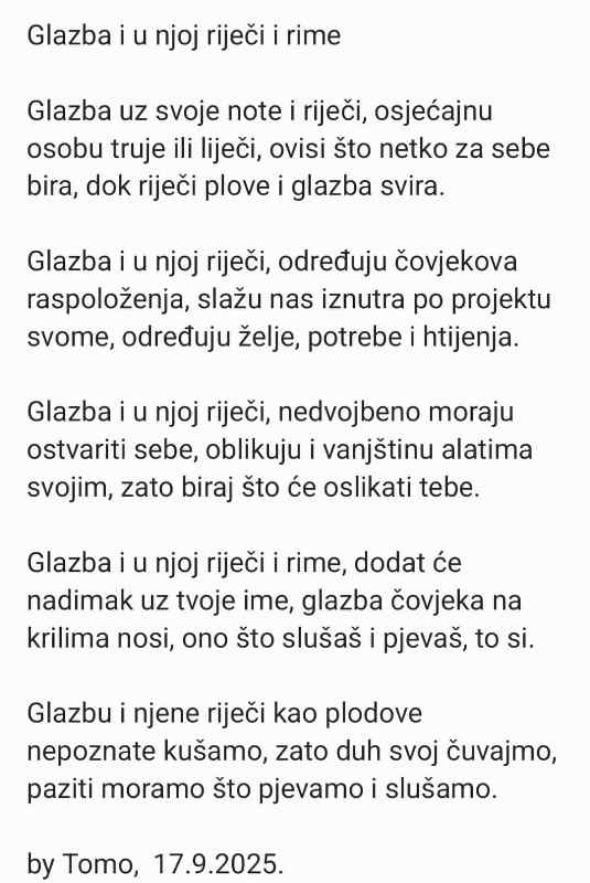 književnostTOMO RAIČ: “Glazba i u njoj riječi i rime”tomislavnews22. rujna 2025.posted on ruj. 22, 2025 at 5:29 pm2.04KPregleda GLAZBA I U NJOJ RIJEČI I RIME www.tomislavnews.com Tagovi:glazbapjesmarijecirimetiječitomoShare on FacebookShare on XMoretomislavnews22. rujna 2025.prethodni članakVELIKI FOTO INTERVJU s ravnateljicom Doma zdravlja Tomislavgrad, Ivankom Živković, dr.med. spec. ginekologije i opstetricijeidući članakDOBRO vam umjereno vedro, toplo i tiho jutro iz Tomislavgrada! Preporučujemo za vasBosna i HercegovinaknjiževnostTG ČestitkeFOTO ČESTITKA: U sklopu 63. Šimićevih susreta održano predstavljanje zbirke „Pred našom kućom jabuka“ autora Mije Tokićatomislavnews24. travnja 2026.481 views481Pročitaj više...književnostFOTO: Obilježavanje Dana hrvatske knjige u Osnovnoj školi fra Mije Čuića Bukovicatomislavnews22. travnja 2026.712 views712Pročitaj više...književnostvjeraNIKOLA JURIŠIĆ: Put u Emaustomislavnews19. travnja 2026.528 views528Pročitaj više...
