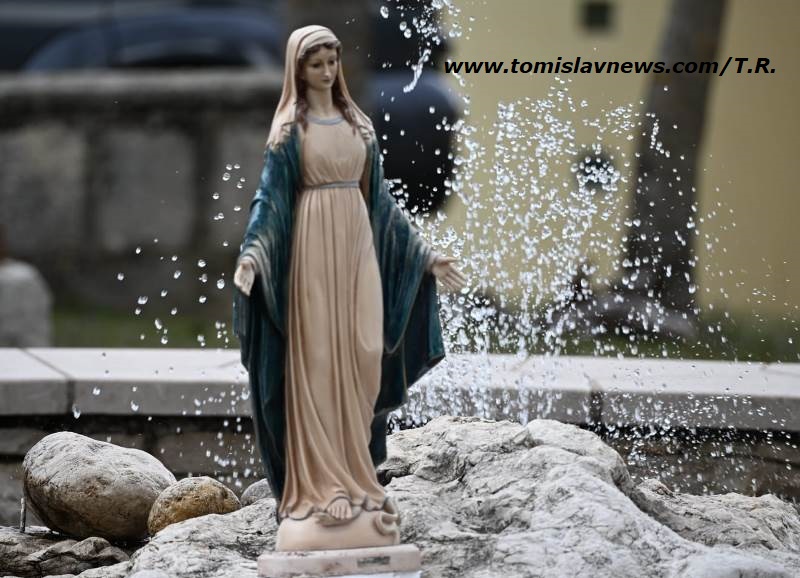 Fotografija je snimljena ispred Župne crkve svetog Frane u Bukovici, 2026. i jedan je od najljepših prizora u duvanjskom kraju: prekrasan kip Djevice na kamenu u fontani ispred crkve, suze radosnice ili rosa sveta